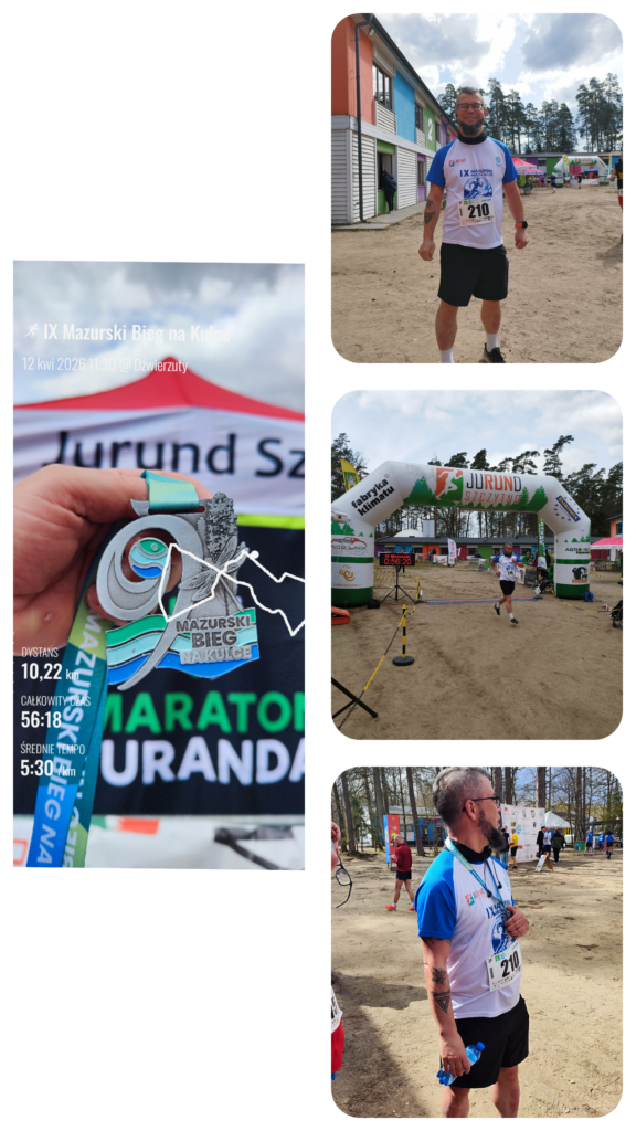 X Mazurski Bieg na Kulce za mną. Jak zwykle na starcie nie obyło się bez małego zamieszania — tym razem złe kieszenie i finalnie bieg bez telefonu 😄