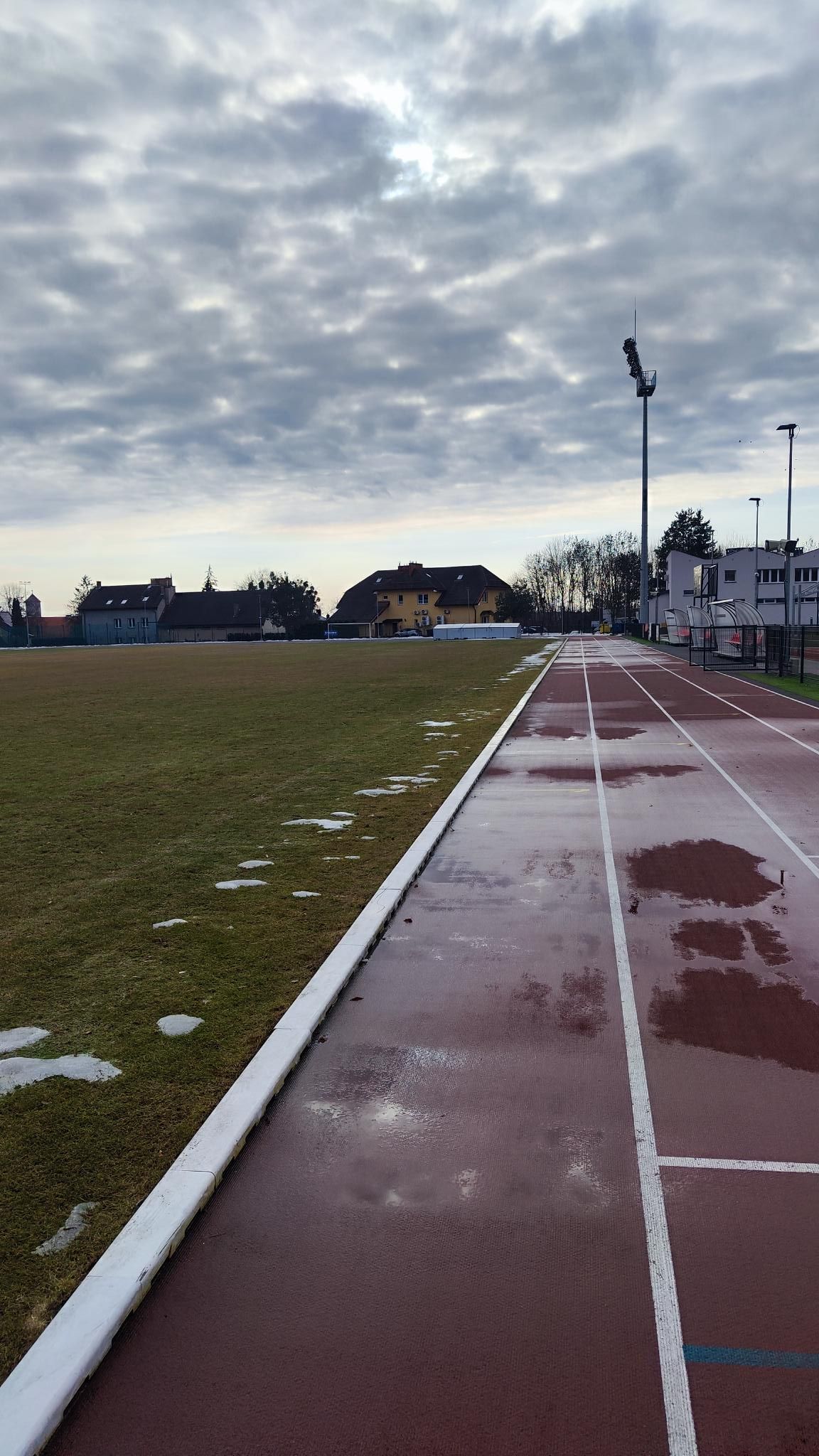 Trening wszedł lepiej niż się zapowiadało — mimo braku motywacji przed wyjściem, na stadionie złapałem rytm i wszystko zaczęło się układać. Spokojna część biegu pod kontrolą, bez szarpania tempa, a na końcu kilka przebieżek dla pobudzenia szybkości. Warunki mokre, miejscami kałuże, ale bez ślizgania — raczej na plus dla stabilizacji.